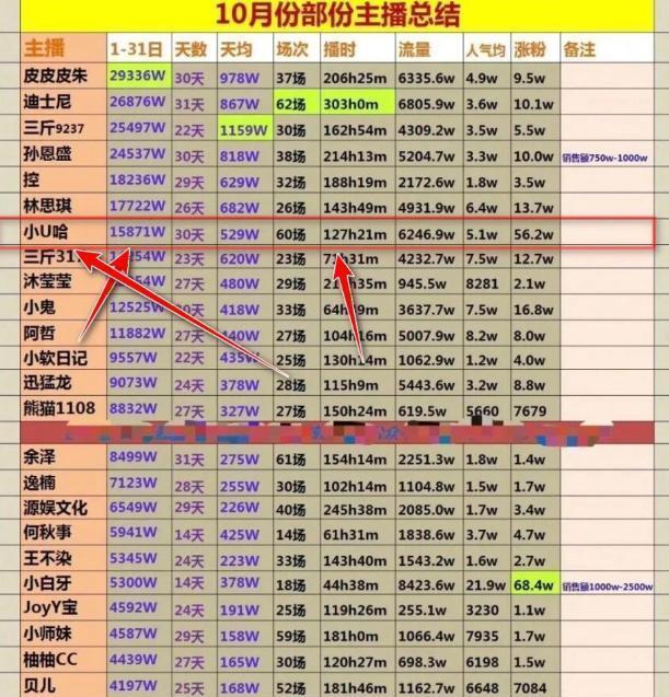 在入驻某音一个月的时间里,小U哈除了将自己的老粉带到了某音之外,同时也将自己的大哥带到了这里,仅仅一个月的时间里面,小U哈就直接登顶某音10月主播收入排行榜第7名!10月的直播收入更是超过1500万。