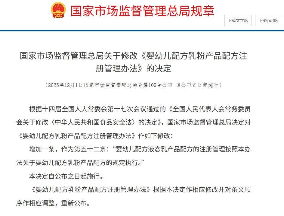 【大河财立方消息】12月1日,市场监管总局发布《关于修改〈婴幼儿配方乳粉产品配方注册管理办法〉的决定》,明确“婴幼儿配方液态乳产品配方的注册管理按照本办法关于婴幼儿配方乳粉产品配方的规定执行”。婴配液态乳产品配方注册申请的受理、技术审评、现场核查等程序和要求大盈家,总体上与婴幼儿配方乳粉产品配方注册保持一致。
