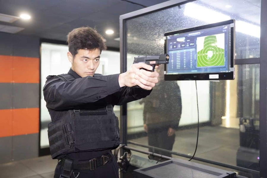 基地内的智能靶场同样科技感十足,不仅支持实弹、虚拟射击双模式训练,还能逼真模拟各类极端天气,让实战射击的场景感拉满:通过淋蓬头、打泡机、闪光灯组合,搭配专业音响系统,精准模拟雨、雪、雷、风等恶劣天候;靶场最内侧的受弹区还设有高清幕布,可投影不同天气的动态画面,让射击训练更具身临其境的沉浸感。射击过程中,弹着点实时清晰显示在可移动的靶车智能屏上,以便民警随时查看成绩,后台同步留存精准训练数据,教官据此开展弹道分析等个性化指导,更有针对性地提升民警射击技能与实战处置水平。