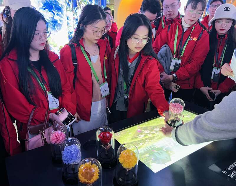 12月1日,云南昆明,中国斗南花卉展览馆,越南青年走进智慧种植·鲜花生长打卡空间。中青报·中青网记者 蒋继璇/摄