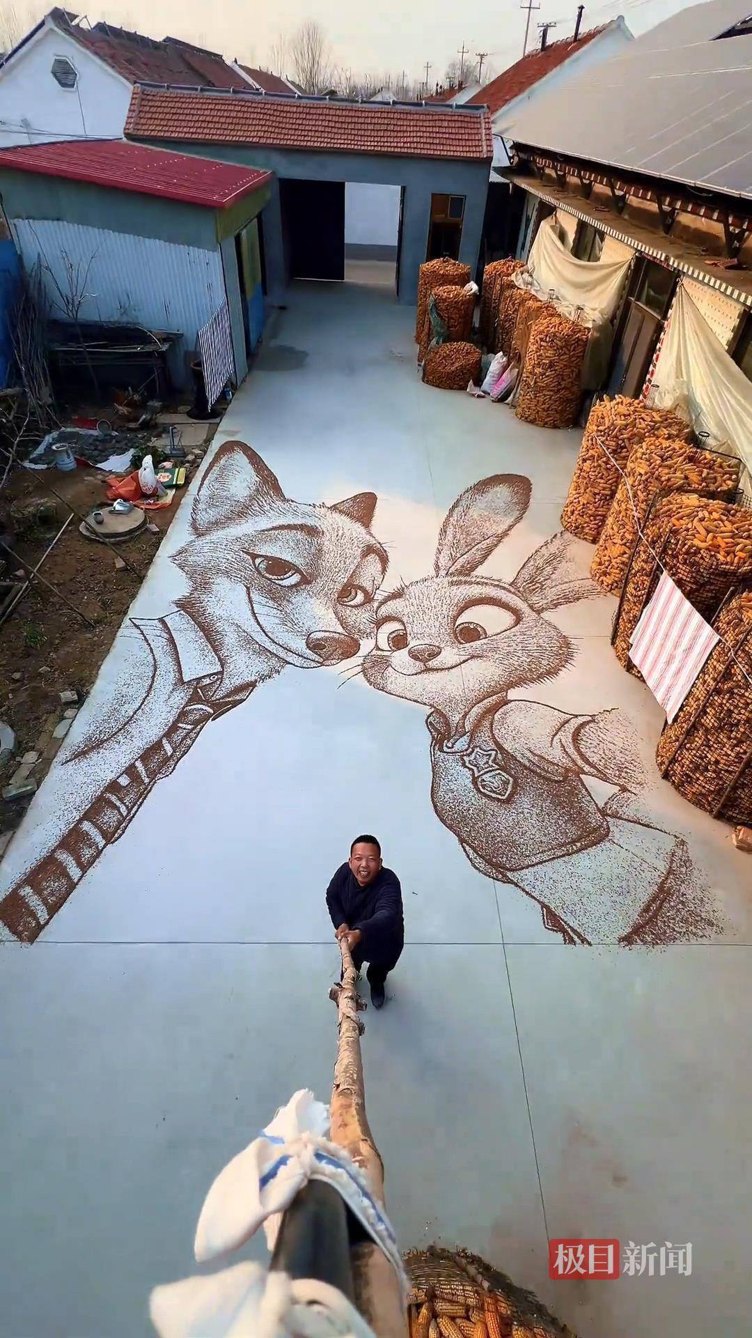 “一个兔子警官朱迪,一个老搭档狐狸尼克,面积总共有15㎡左右,用了50斤黑小麦,用时6小时左右,直到下午3时才全部完成。”赵同恺说,选择黑小麦是因为它和水泥地面的色彩对比较强,但拼图的过程比较麻烦,要不断用手在地面“扒拉”小麦粒,最后用长木棍绑着手机拍照,检查画面是否完整、形象、逼真。